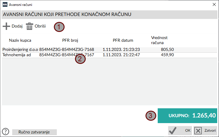 Pošto izaberete fiskalne dokumente avans - prodaja, oni će biti prikazani u tabeli koja je na slici označena brojem 2. Ukupan iznos fiskalnih dokumenata avans - prodaja koji prethode konačnom računu prikazan je u delu prozora koji je na slici označen brojem 3.